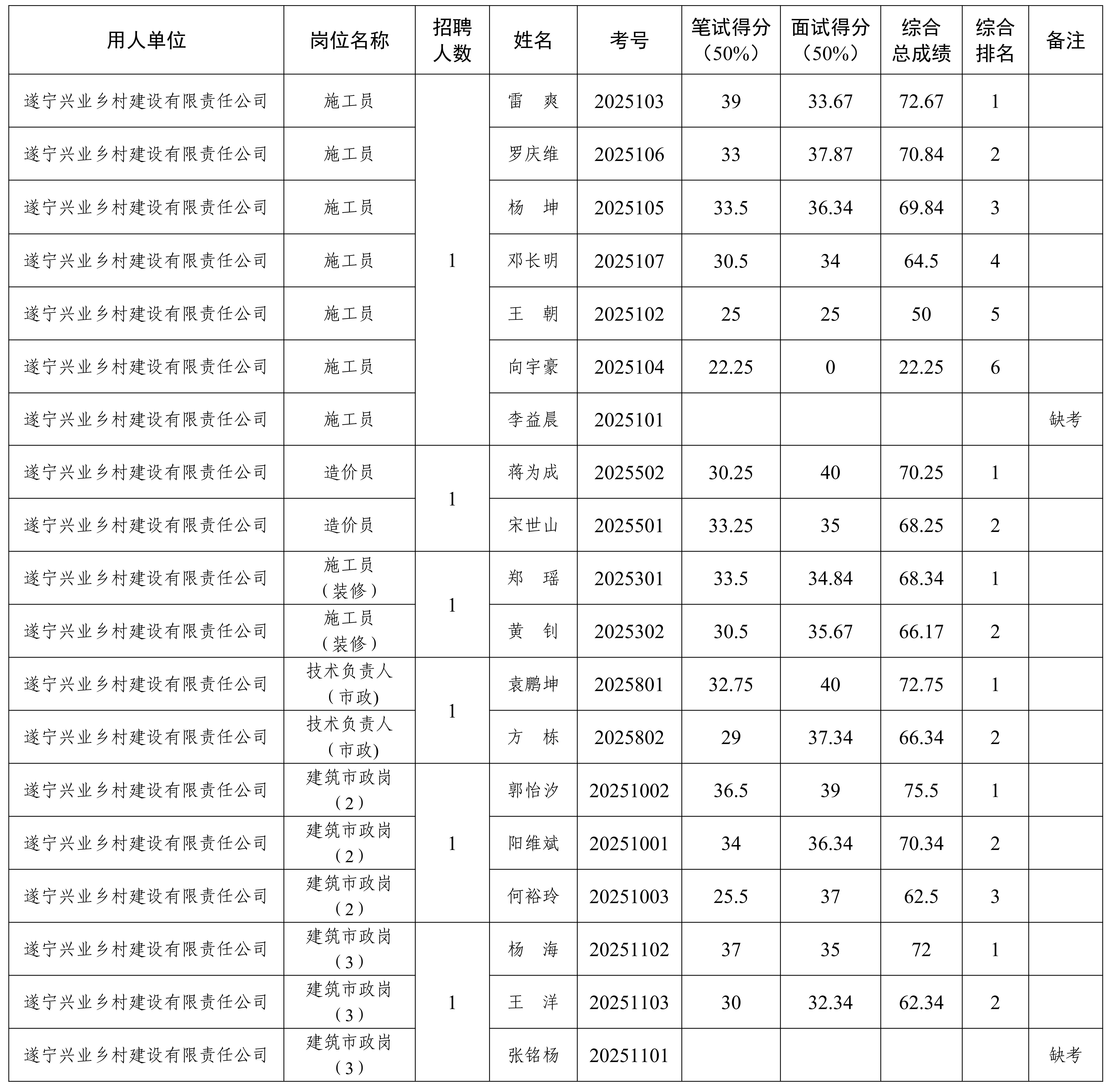 按照《遂寧興業(yè)投資集團(tuán)有限公司項(xiàng)目合同制用工招聘公告》相關(guān)規(guī)定,公開招聘項(xiàng)目合同制工作人員的筆試、面試工作已于2025年8月9日結(jié)束,現(xiàn)將綜合總成績(jī)及排名情況予以公示。
